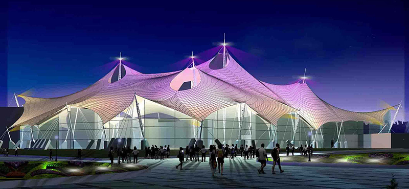 張拉膜是由多種高強薄膜材料及加強構(gòu)件(鋼架、鋼柱或鋼索)通過一定方式使其內(nèi)部產(chǎn)生一定的預(yù)張應(yīng)力以形成某種空間形狀,作為覆蓋結(jié)構(gòu),并能承受一定的外荷載作用的一種空間結(jié)構(gòu)形式。
