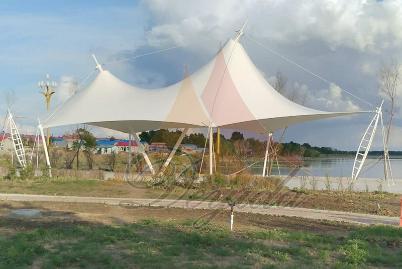 張拉膜結(jié)構(gòu)的美就在于其“力”與“形”的完美結(jié)合。張拉膜結(jié)構(gòu)的基本組成單元通常有:膜材、索與支承結(jié)構(gòu)(桅桿、拱或其他剛性構(gòu)件)。